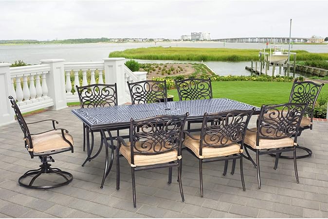 Hanoverhanover Traddn7pcbr Traditions 7 Piece Rust Free Tan Cushions 6 Counter Height Swivel Chairs And Aluminum Round Bar Table Outdoor Furniture Dailymail from m.media-amazon.com