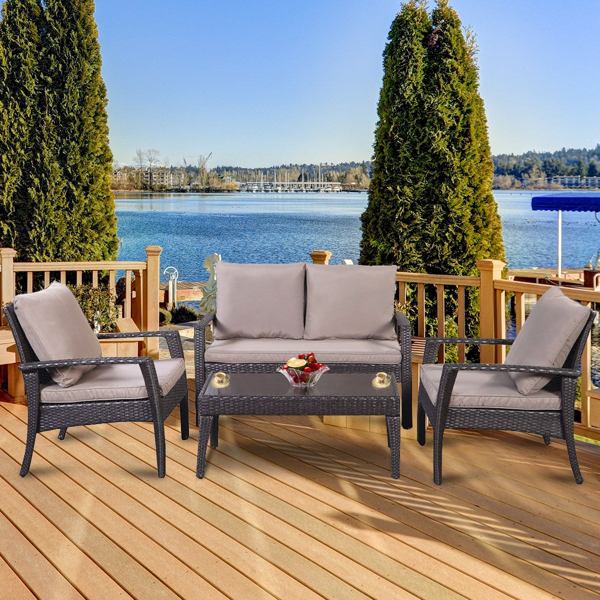 You can enjoy a relaxing nap or. We provide a selection of indoor & outdoor furniture,home decor products.find our lowest possible price!. This 4 pieces black furniture set including 1 loveseat, 2 single sofas and 1 tea table can not only make your outdoor life more comfortable, but also let your garden more beautiful.