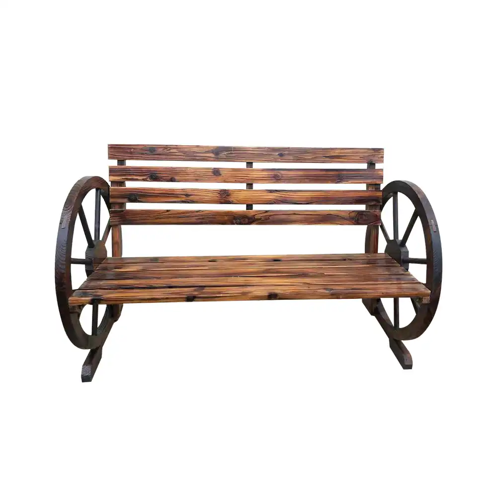 The armrests feature a unique wagon wheel design that is sure to make this bench a conversation piece among your guests.